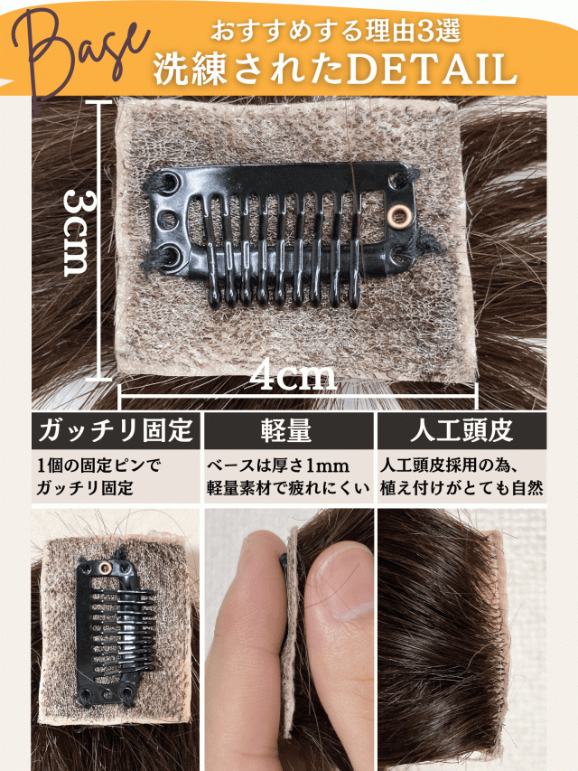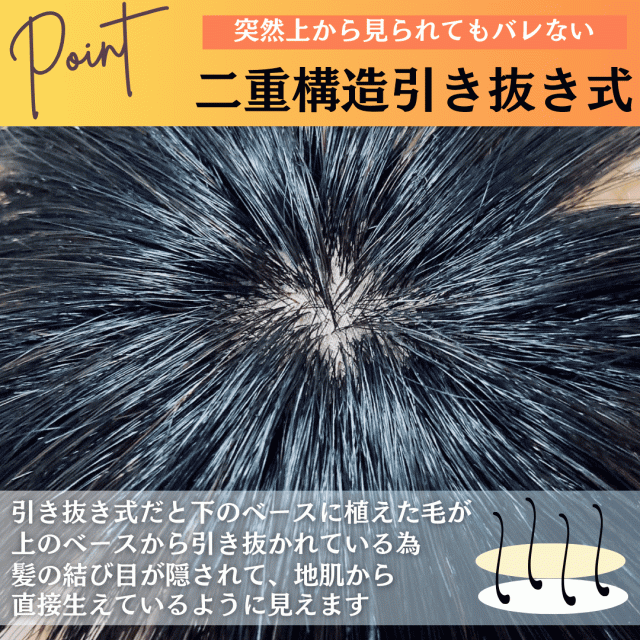 | 特徴2 | 植毛方法にもこだわり、二重構造&引き抜き式を採用。ナチュラルなI型つむじを実現 |