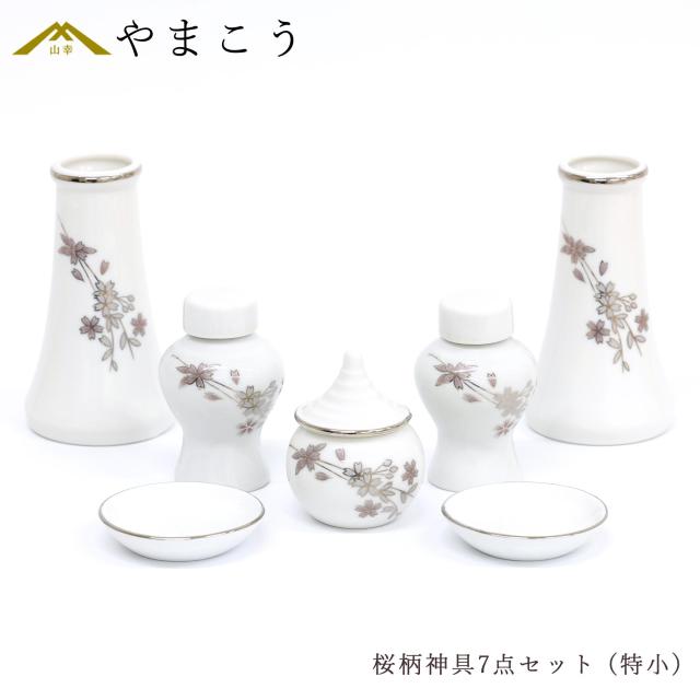 神具セット 桜柄 7点 セット 特小 榊立て 瓶子 水玉 皿 ミニ モダン お供え お祀り 神棚 神具