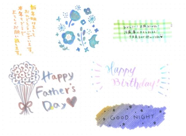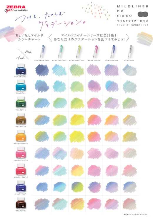 ペンと違う色のインクにマイルドライナーシリーズのペン先を直接つけることで、全部で306通りのグラデーションが生まれ、自分だけの表現を楽しむことができます。