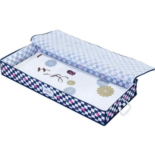 【商品仕様】:サイズ/約幅96×奥行40×高さ13cm、カラー/ネイビー×ホワイト、柄/市松模様×桜柄、内容/1個、収納目安/たとう紙に入った着物(浴衣)なら約3〜4枚・着物(浴衣)数枚と帯などの和装小物をまとめて収納も可能、材質/ポリプロピレン