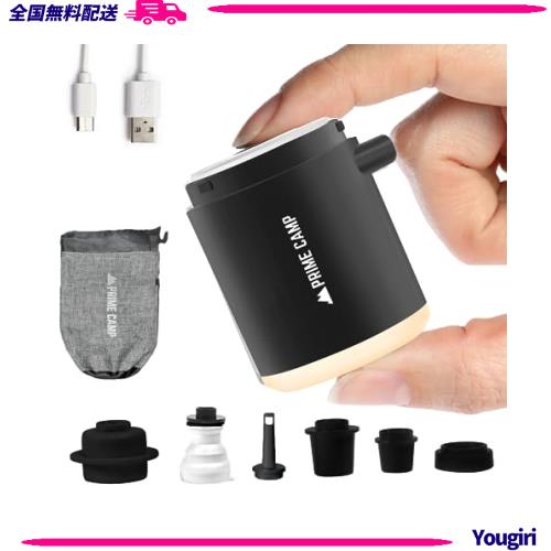プライムキャンプ エアーポンプ 電動 空気入れ 超軽量 強力170L/分 【6つのノズル&ライト付】 エアポンプ 1380mAh大容量バッテリー USB