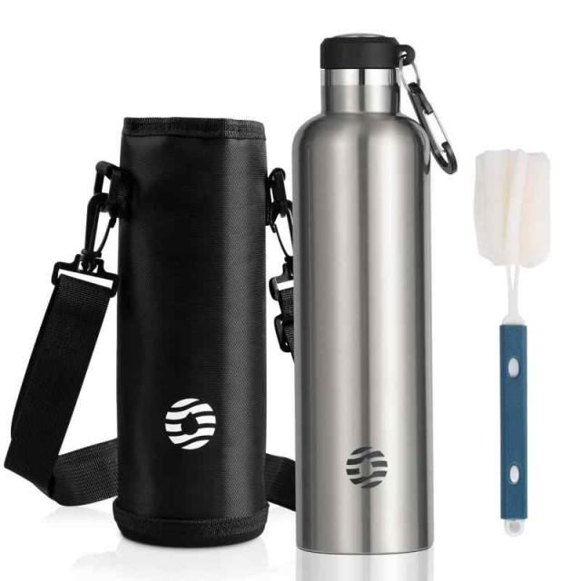 FJbottle 水筒 1リットル 真空断熱 保温 保冷 第2世代 ステンレスボトル 直飲み スポーツボトル スポーツ飲料対応 水筒カバー 洗浄用スポンジ付き 男の子 女の子 大人 子供 (シルバー, 1000 ml)