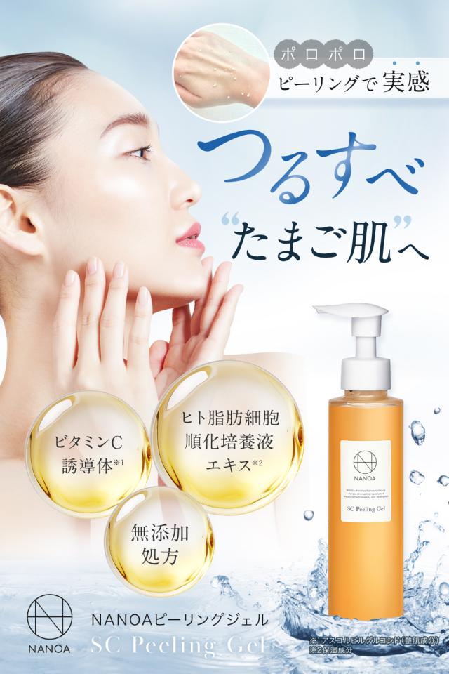 ◆ 「ポロポロピーリングで実感!つるすべたまご肌へ」 ナノアピーリングジェルは、酵素成分のチカラで古い角質や汚れ・角栓をしっかり落とし、くすみのないすべすべ肌へ導くピーリングジェルです。ヒト幹細胞培養液とビタミンC誘導体を贅沢に配合。