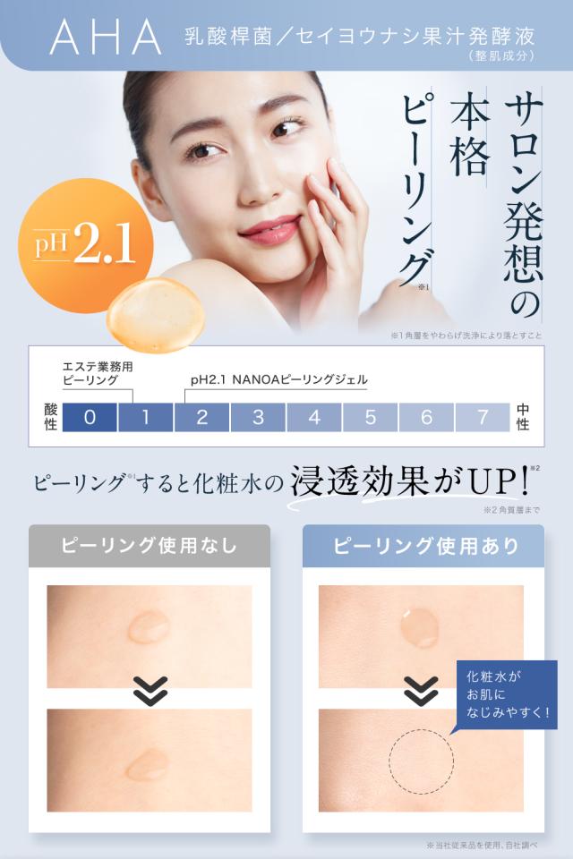 ◆ 業務用ピーリングと近い酸性レベルpH2.1を実現することでエステ級のピーリング効果。ピーリングをすることで化粧水の浸透効果を高め、肌なじみ、肌への浸透、化粧ノリが良くなります。
