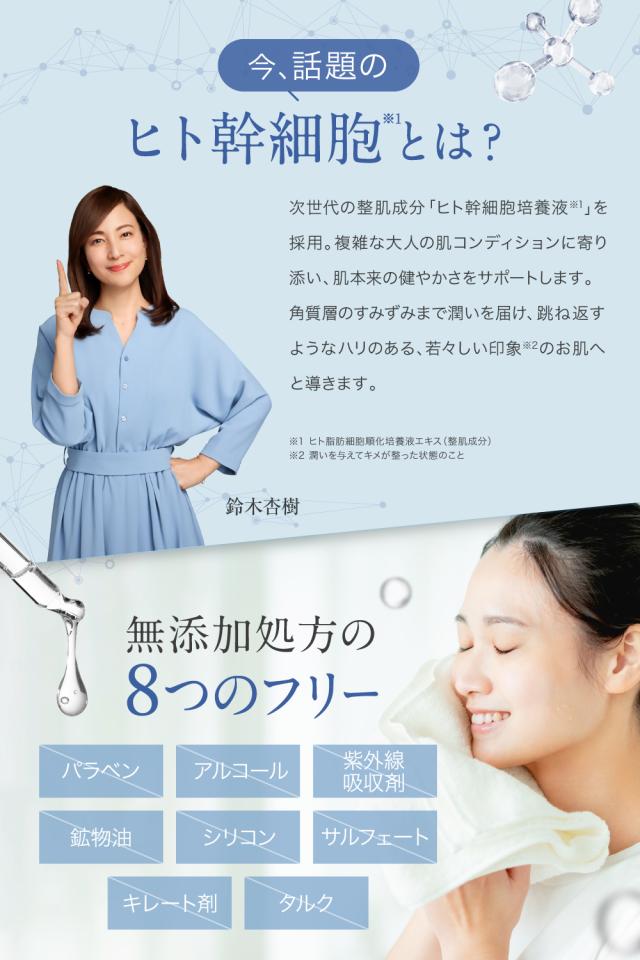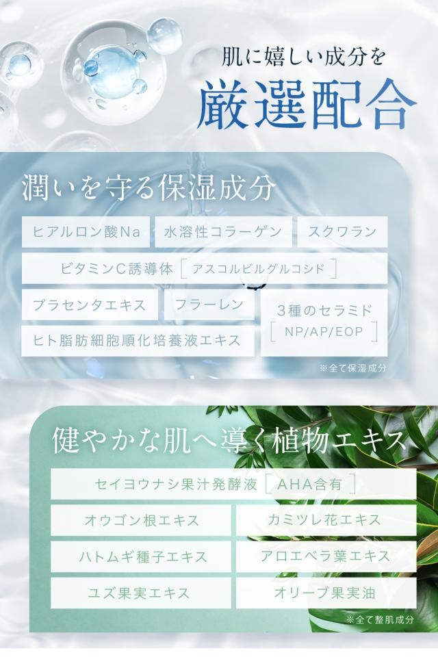 【成分】水、グリセリン、カルボマー、セトリモニウムクロリド、乳酸桿菌/セイヨウナシ果汁発酵液、ヒト脂肪細胞順化培養液エキス、アスコルビルグルコンド、プラセンタエキス、フラーレン、トロポロン、BG、ヒアルロン酸Na、オウゴンエキス、カミツレ花エキス、ハトムギ種子エキス、1,2-ヘキサンジオール、アロエベラ葉エキス、カプリリルグリコール、ユズ果実エキス、水溶性コラーゲン、(クエン酸/乳酸/リノール酸/オレイン酸)グリセリル、オリーブ果実油、セラミドNP、セラミドAP、フィトスフィンゴシン、セラミドEOP、スクワラン、コレステロール、キサンタンガム、ラウロイルラクチレートNa、ポリソルベート60、香料、橙205