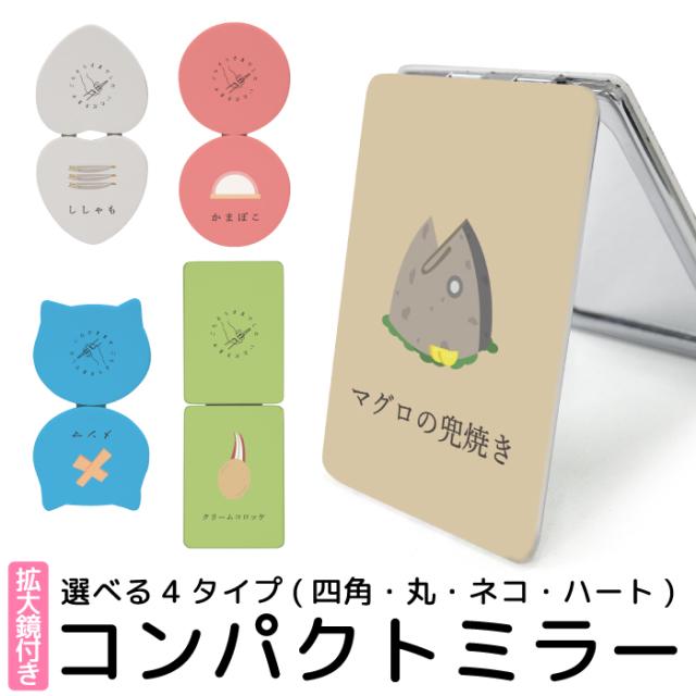 コンパクトミラー 折りたたみ 鏡 コンパクト ミラー 拡大鏡 付 携帯ミラー デザイン プリント ハンドミラー 二つ折り 手鏡 丸型ミラー 両面ミラー 面白い ししゃも メンマ 鮪 四角 長方形 丸 円 ねこ 猫 ネコ ハート kgm053