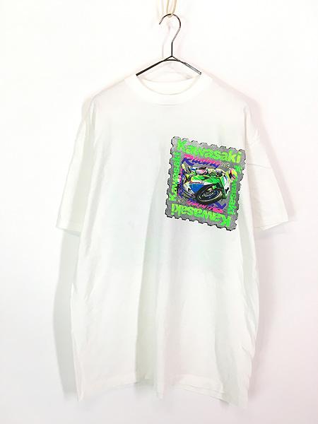 古着 90s USA製 Kawasaki モーターサイクル レーシング 蛍光 ネオン 切手 グラフィック Tシャツ XL 古着
