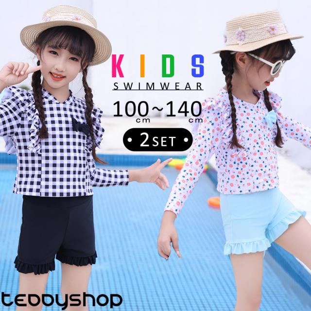 夏新作 キッズ 水着 女の子 セパレート セット フリル トップス 長袖 ショートパンツ 2点セット ラッシュガード 花柄 ギンガムチェック リボン 子ども Vネック ハイウエスト パッド付き パッド入れ替え 一部サイズ 幼稚園 保育園 小学生 低学年