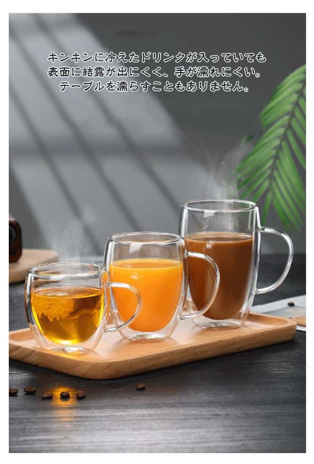 | 【ダブルウォールグラス】【2個セット】 【150ml 250ml 300ml 350ml 450ml】 飲み頃温度をキープできるおしゃれなダブルウォールグラス。 ダブルウォール(二重構造)のグラスが冷たさ・暖かさを長くキープします。 キンキンに冷えたドリンクが入っていても表面に結露が出にくく、手が濡れにくい。 テーブルを濡らすこともありません。 さらに、ホットドリンクが入っていても表面が熱くなりすぎず、中身が熱々のままでもグラスを持てるのが特徴です。 耐熱グラスで冷温両用なのでいろんな飲み物に使えます。 ドリンクだけでなくヨーグルトやスープ、スイーツ、フルーツ、デザートカップにも◎ オールシーズンあらゆるシーンで活躍。 | |