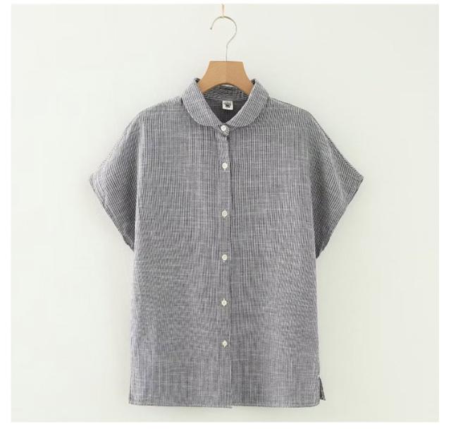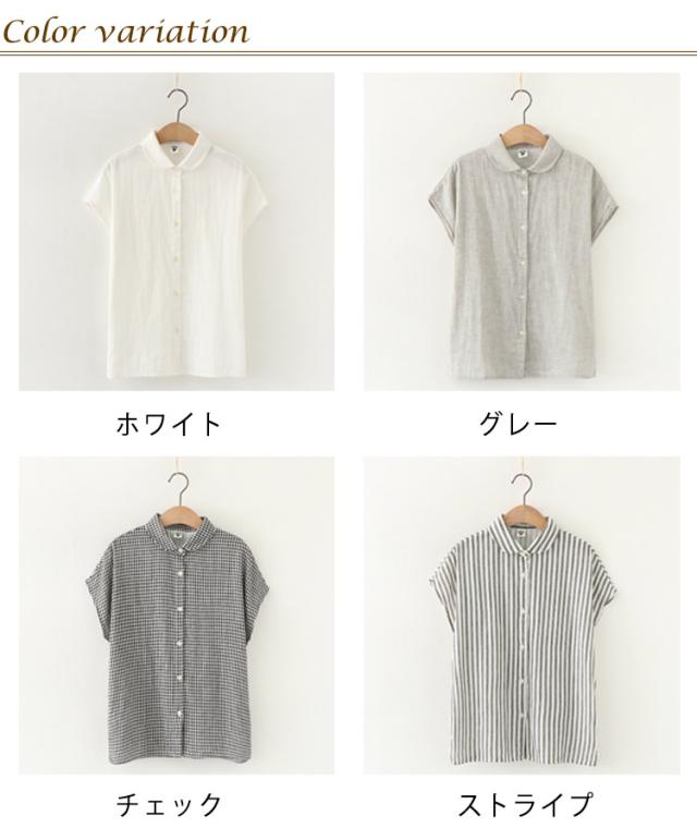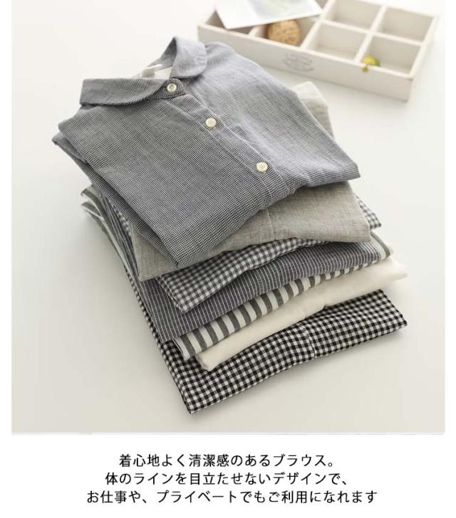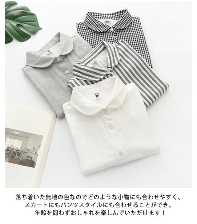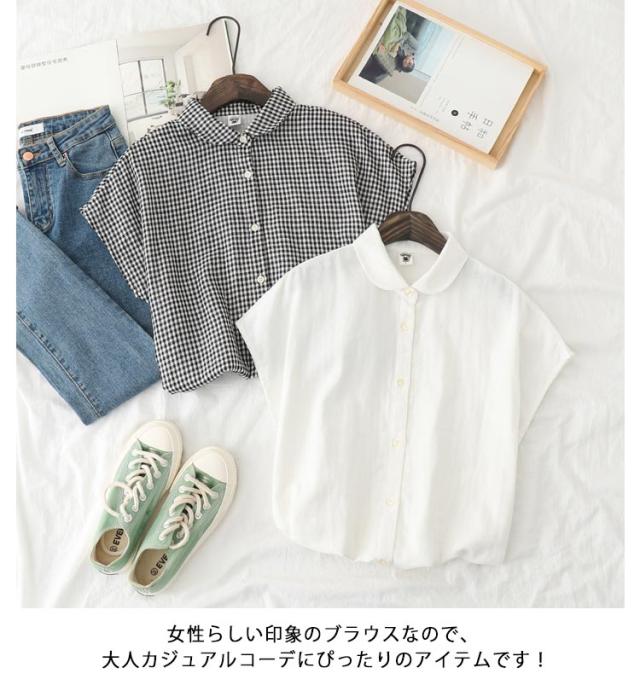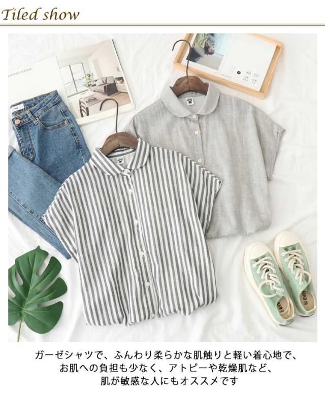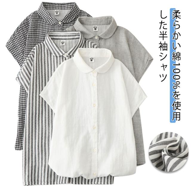 レディース 丸襟 半袖 シャツ ダブルガーゼ カジュアル シャツブラウス ストライプ シャツ ブラウス トップス フレンチスリーブ 折り襟 シャツ 無地 チェック 半袖 ゆったり 大きいサイズ 体型カバー 通勤 夏 シンプル