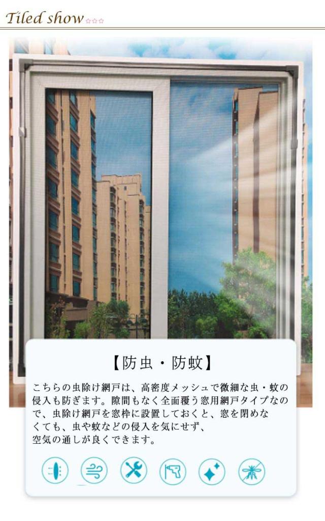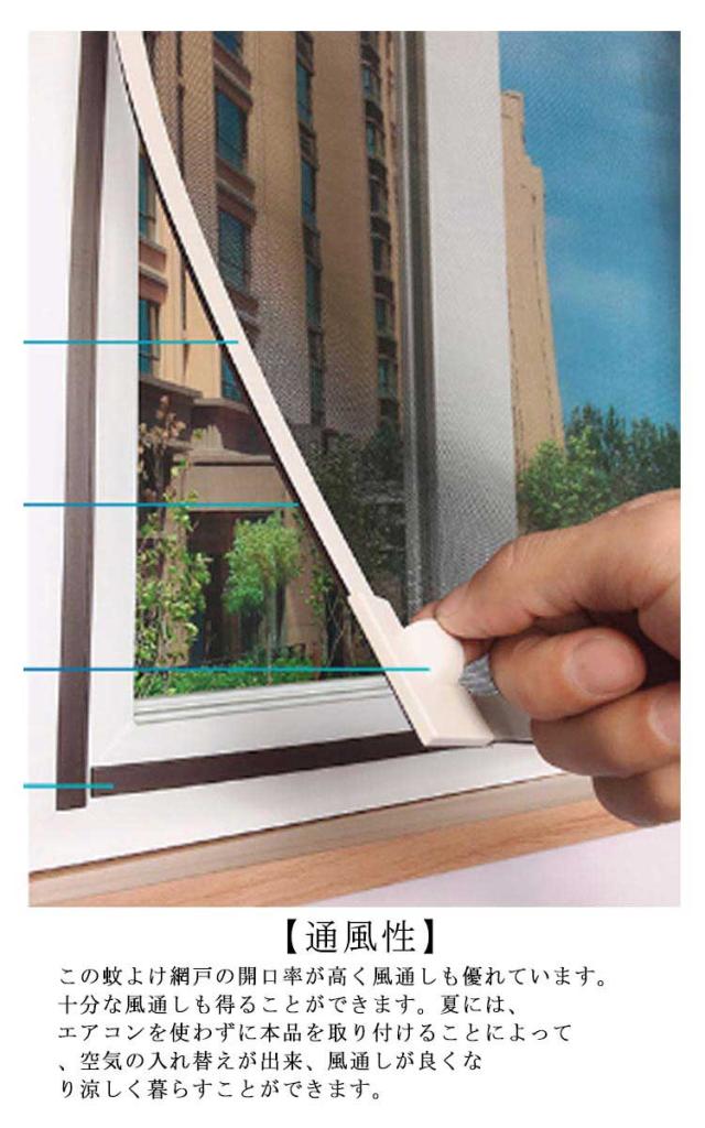 | お部屋の換気や虫よけ対策にぴったり! 【マグネット取り付け】 【カット可能・サイズ調節可能】 【防虫・防蚊】こちらの虫除け網戸は、高密度メッシュで微細な虫・蚊の侵入も防ぎます。隙間もなく全面覆う窓用網戸タイプなので、虫除け網戸を窓枠に設置しておくと、窓を閉めなくても、虫や蚊などの侵入を気にせず、空気の通しが良くできます。 【カット可能・サイズ調節可能】この防虫ネットは、カットによるサイズ調節が可能です。お宅の窓大きさに完璧に合わせて防虫ネットをカットできます。だから、この防虫ネットはどんな窓枠にも網戸がぴったりと納まります。この防虫ネットキットがあれば、網戸を作るお手間もお金も節約します。 【通風性】この蚊よけ網戸の開口率が高く風通しも優れています。十分な風通しも得ることができます。夏には、エアコンを使わずに本品を取り付けることによって、空気の入れ替えが出来、風通しが良くなり涼しく暮らすことができます。 【優れた耐久性】こちらの虫よけ網戸は、マグネットを採用し、繰り返し開閉できます。高品質のメッシュを使用し、精密縫製と高密度のメッシュ技術を採用、多くの開閉でも丈夫で損耗しません。また、虫よけ網戸は取り外せるので、そのまま丸洗いができます。お手入れもラクラクです。 | |