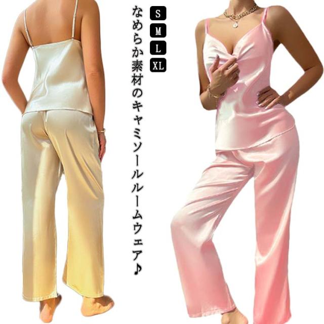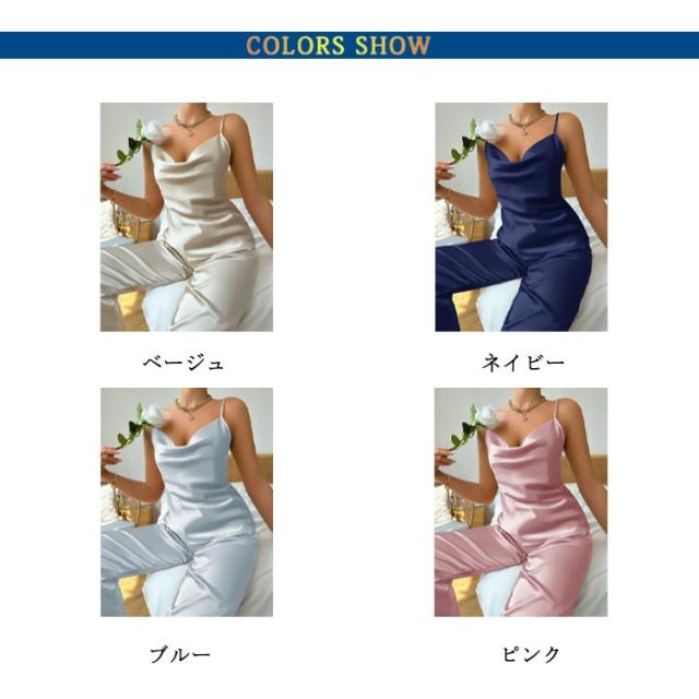 ナイトウェア サテン 無地 ルームウェア ロングパンツ キャミソール レディース サテン パジャマ 長袖 シルクタッチ シルクタッチ 上下セット 部屋着 かわいい 上下セット 女子 シルク風 婦人 パジャマ ベージュ ネイビー ブルー