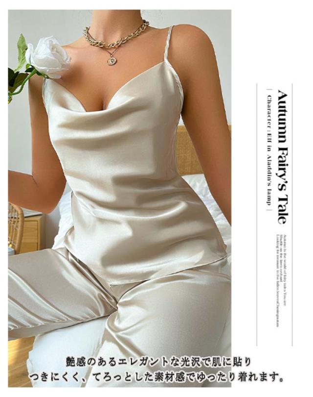| なめらか素材のキャミソールルームウェア♪ 大人女子はシルクタッチルームウェアでお家でリラックス。 艶感のあるエレガントな光沢で肌に貼りつきにくく、てろっとした素材感でゆったり着れます。 シルクタッチで着心地抜群なのでルームウェアにも♪贅沢な睡眠やリラックスタイムをお過ごしください。 カラーによって雰囲気がとても変わるので、2色買いもオススメ♪ お友達やご家族へのプレゼントにもぴったりです! | |