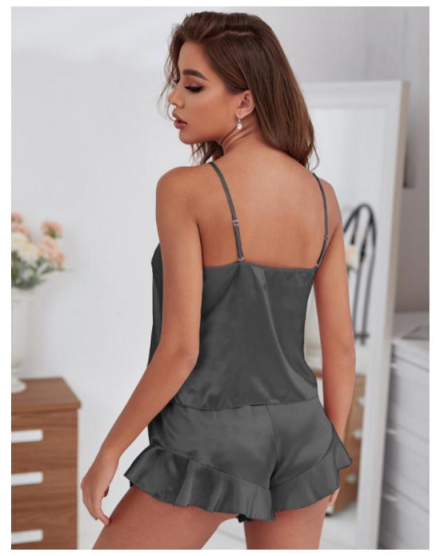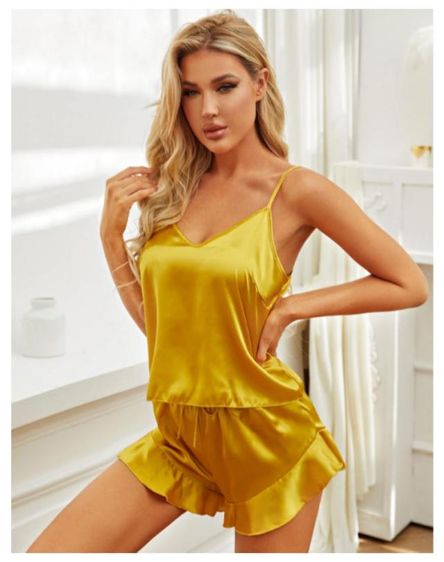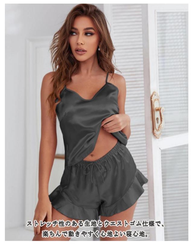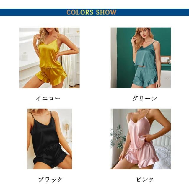 Vネック ルームウエア パジャマ レディース キャミソール ショートパンツ フリル 部屋着 サテン ノースリーブ 夏 光沢 可愛い インナー スリップ タンクトップ ペチパンツ ナイトウェア 大人 ルームウェア 春夏 薄手 上下セット セットアップ