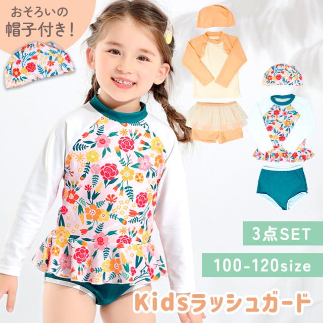 ラッシュガード/3点セット/帽子付き/キッズ/ガールズ/女の子/セパレート/100/110/120/水着/キャップ/上下セット/ラッシュガード付き/日焼け対策/着やすい/長袖/日差し対策/熱中症対策/スイムウェア/フリル/かわいい/おしゃれ/可愛い/子供/プール/海/夏/海水浴/水遊び/小学生/幼稚園/保育園/3歳/4歳/5歳/6歳/7歳/キッズ水着/みずぎ/ガールズ水着/水泳/セパレート水着/女児/トップス/スカート/ファッション水着/水陸両用/TN-SRHG/