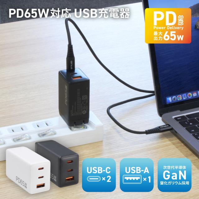 PD65W USB 充電器 AC 充電器 USB×3(C×2・A×1) GaN 最大65W PC充電 急速充電 小型 窒化ガリウム PSE適合 折りたたみ式プラグ PACCAC2-P65 iPhone Type-C スマホ バッテリー Apple Watch PACCAC2-P65BK