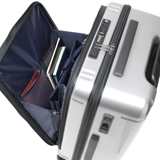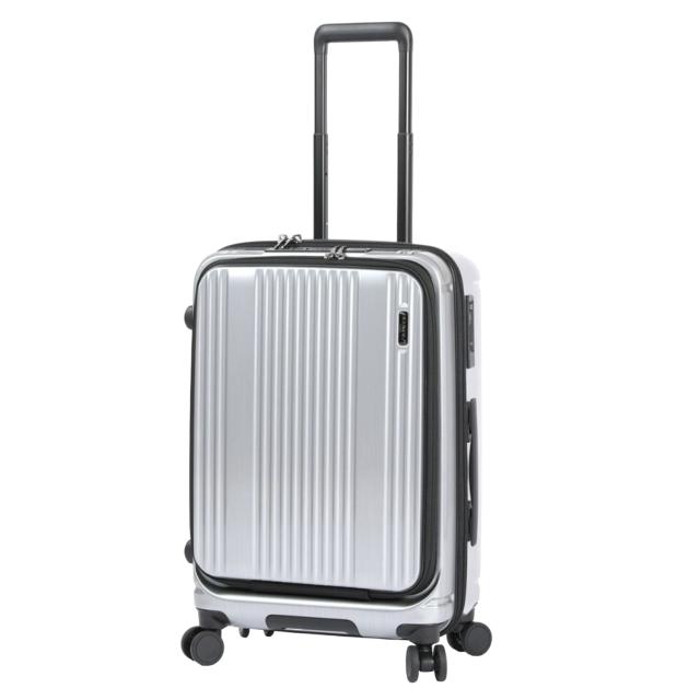 ストッパー付きでビジネスユースをより快適にするフロントオープンキャリー。キャスターのストッパーは本体側面に設置されたスライドスイッチで簡単にロック・アンロックが可能です。