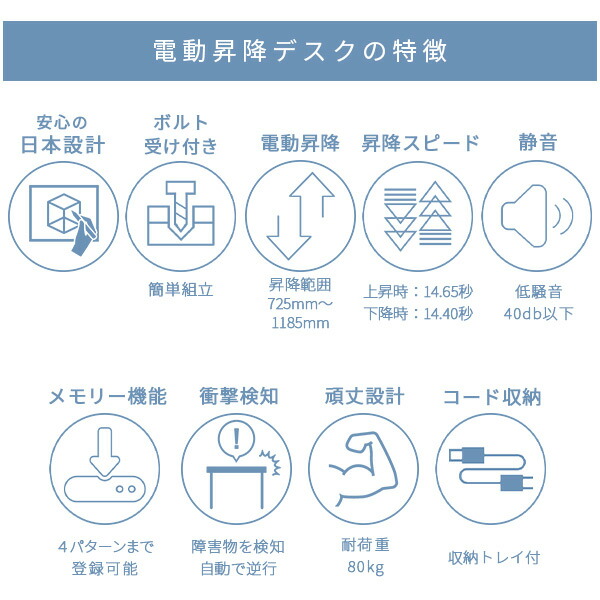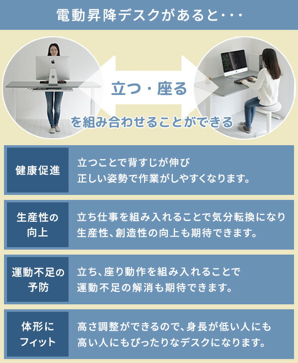 | 商品説明 | ●ワンタッチで高さを自由にセットできる電動昇降デスク ●2つのAC電源とUSB差込口のある電源タップ付き ●天板8色×脚部2色!選べる豊富なカラー展開 ●高さ表示&メモリー機能付きリモコン ●4パターンまでメモリー登録可能 ●天板はゆったり作業できる奥行70cm ●天板裏にマグネット式のものが取り付けできるスチールプレート付属 ●横揺れも少なく安定感のある脚部フレーム ●ガタつきを抑えるアジャスター付き ●耐荷重:80kg(均等荷重) ●消費電力:240W 【重要】組み立てについて 天板と脚が分かれた2個口でのお届けとなります。 大型で重量もございます。お二人以上での搬入、組み立てをお願いいたします。 プラスドライバーのご用意をお願いいたします。 |