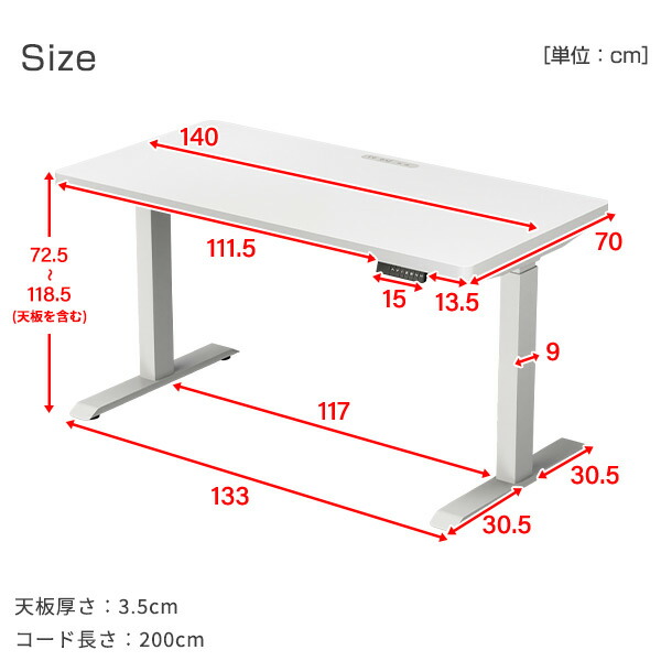 | 本体サイズ | 幅140×奥行70×高さ72.5-118.5cm 重量47.5kg |