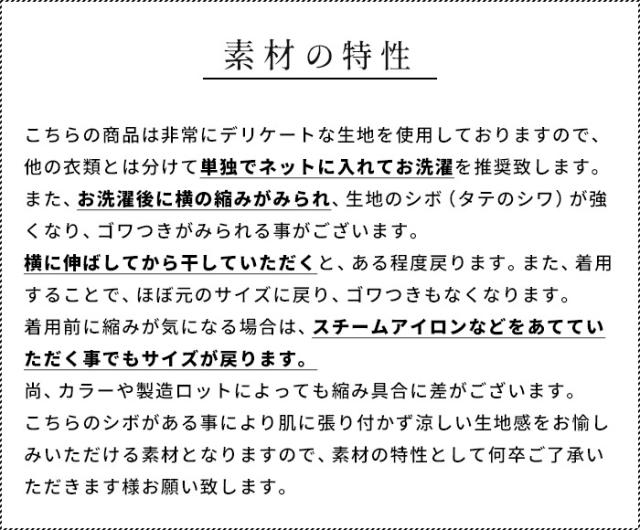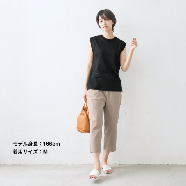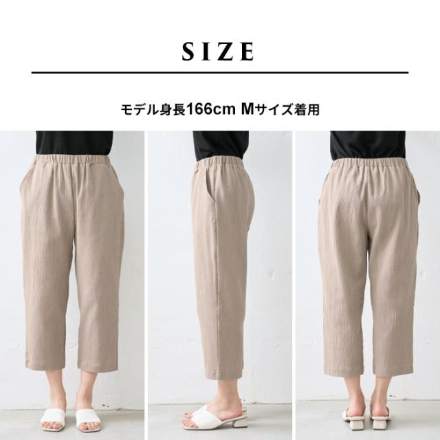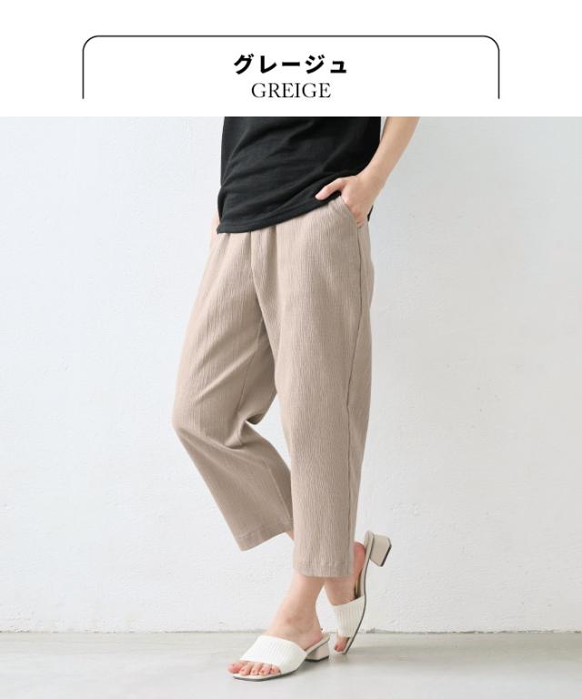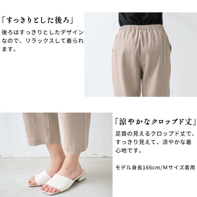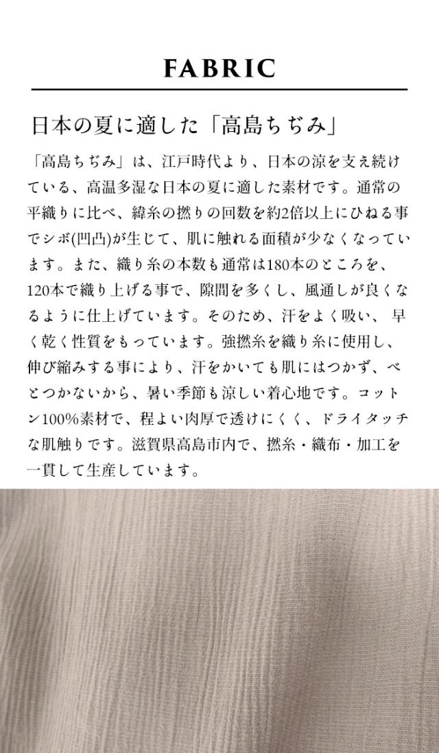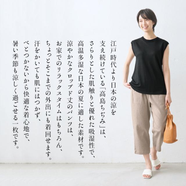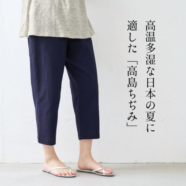 特徴 江戸時代より日本の涼を支え続けている「高島ちぢみ」は、さらりとした肌触りと優れた吸湿性で、高温多湿な日本の夏に適した素材です。涼やかなクロップド丈のパンツは、お家でのリラックスタイムはもちろん、ちょっとそこまでの外出にも着回せます。汗をかいても肌にはつかず、べとつかないから快適な着心地で、暑い季節も涼しく過ごせる一枚です。