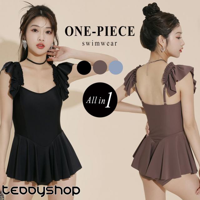 夏新作 水着 体型カバー水着 ワンピース レディース フリル オールインワン フレア ギャザー キャミワンピ ミニ ウエスト切り替え 裾切りっぱなし 肩フリル フェミニン 一体型 モールドカップ ショーツ一体型 お腹 ウエストお尻