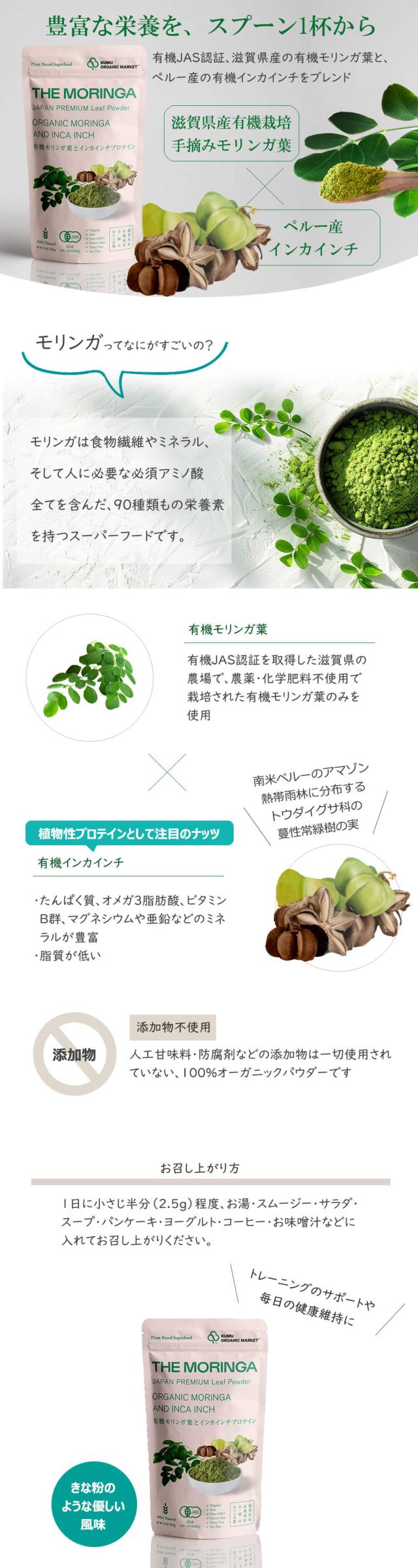 | 原材料 | 有機モリンガ(滋賀県産)、有機サチャインチ種子 |