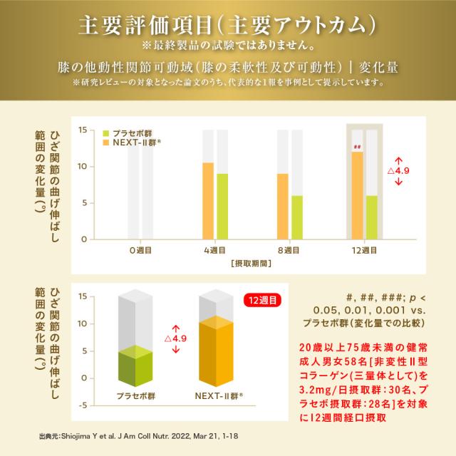 非変性?型コラーゲンは膝(ひざ)関節の柔軟性・可動性を助け、歩く、階段の昇り降り、しゃがむ、正座する、正座や椅子から立つといった日常生活における膝や腰の違和感の軽減、寝返り、腰を反らす、腰をひねる時の腰の違和感の軽減、スムーズな歩行や階段の昇り降りをサポートすることが報告されています。