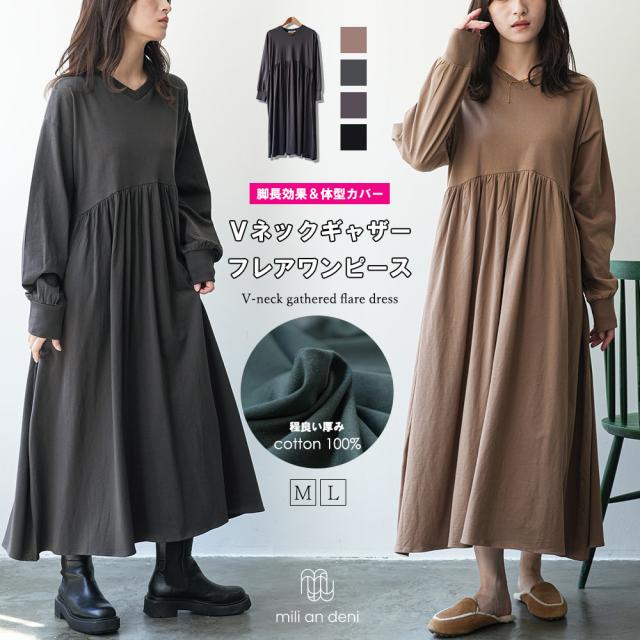 春新作 Vネックギャザーワンピース サイドスリット ロング ボリューム M L ワンピース レディース 春夏 ミリアンデニ o92236