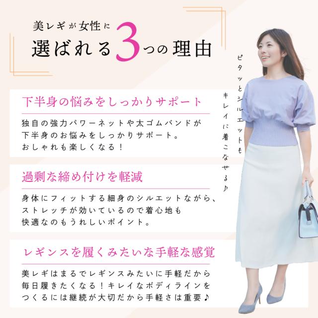 美レギは、気になる体形のお悩み軽減に着目した新感覚・機能レギンスガードルです。 パワーネットがお腹と骨盤をギューッと押さえ、腰回りまでぐるっとしっかりサポートしすっきりと骨盤を引き締めることができます。 身体にフィットする細身のシルエットながら、ストレッチが効いているので着心地も快適なのもうれしいポイント。 ソフトなパワー設計でほどよく骨盤を引き締めたい方や、骨盤と一緒にお腹周りも引き締めたい方におすすめです。