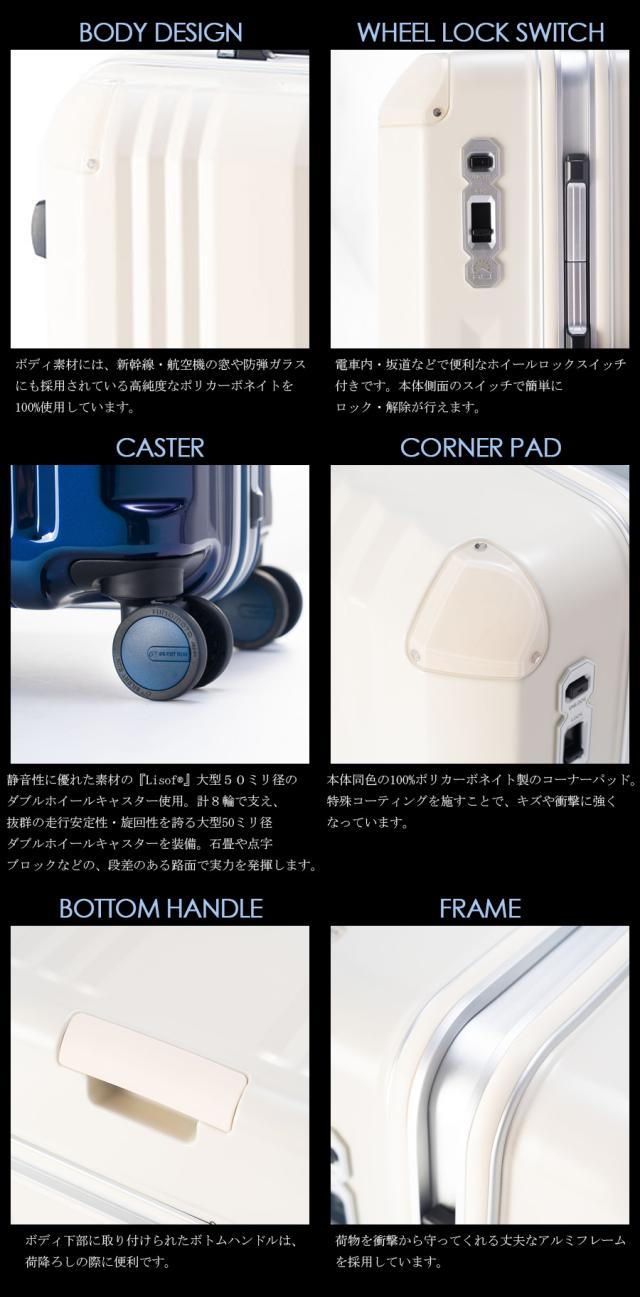 備考:高純度ポリカーボネイト100% / ワンタッチ 前輪ストッパー機能 / HINOMOTO 静音ダブルホイールキャスター”Lisof Silent Run” / ポリカーボネイト製コーナーパッド / シリアルナンバー管理システム