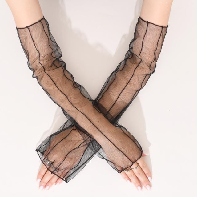 新作 アームカバー レディース ロング丈 長い 薄手 シアー レース 透け感 ブラック 夏 腕カバー 可愛い おしゃれ UVケア 日焼け防止 節電