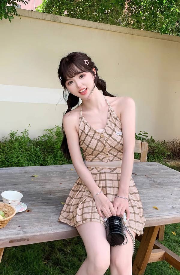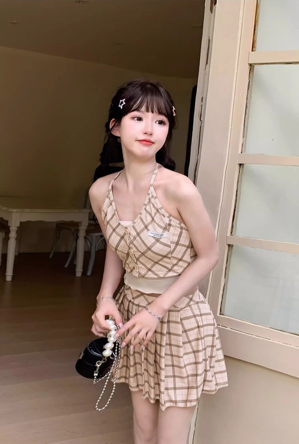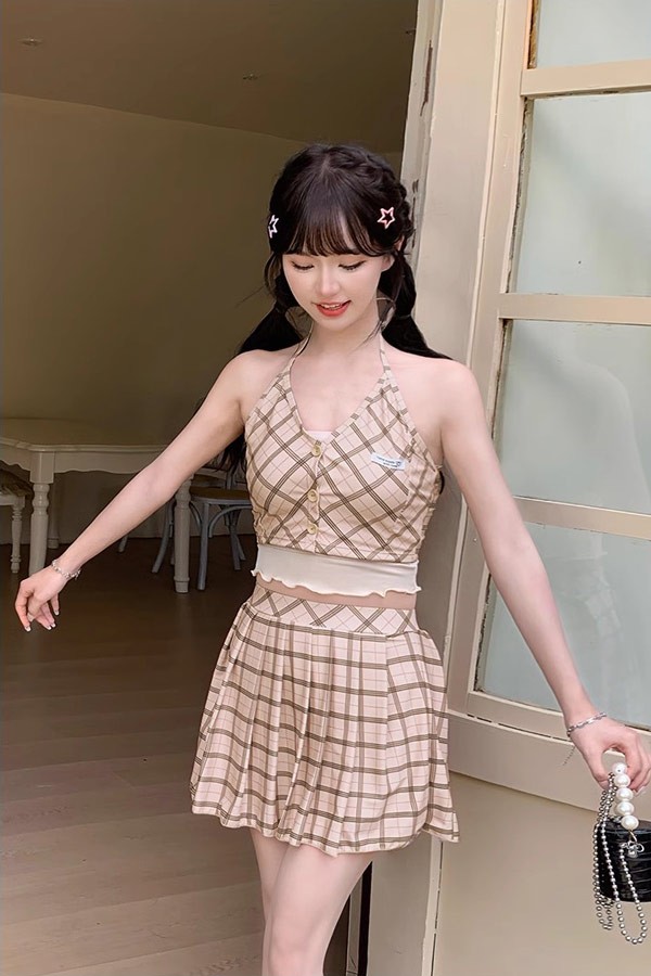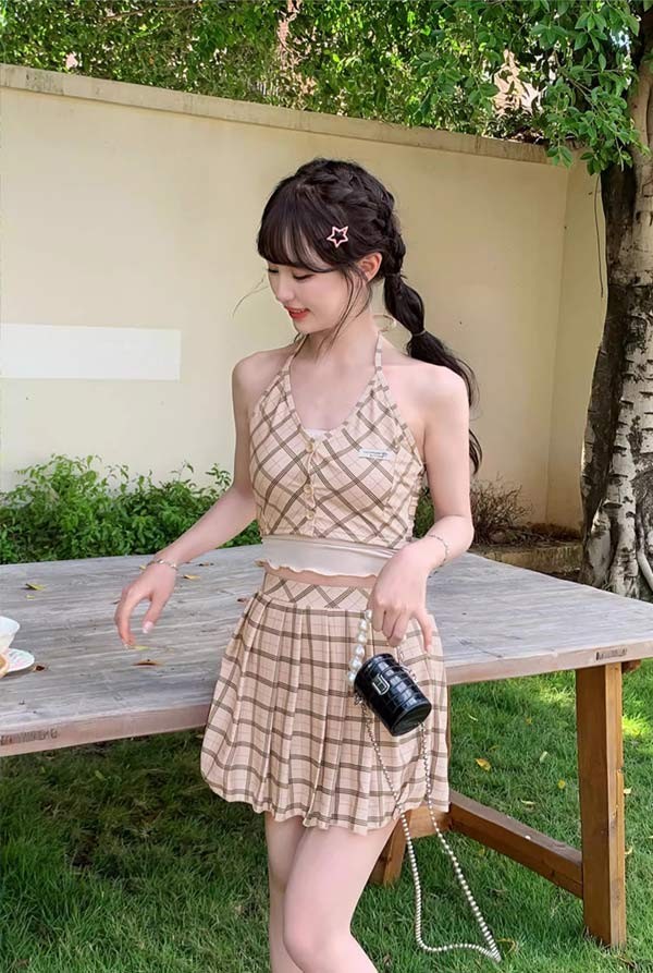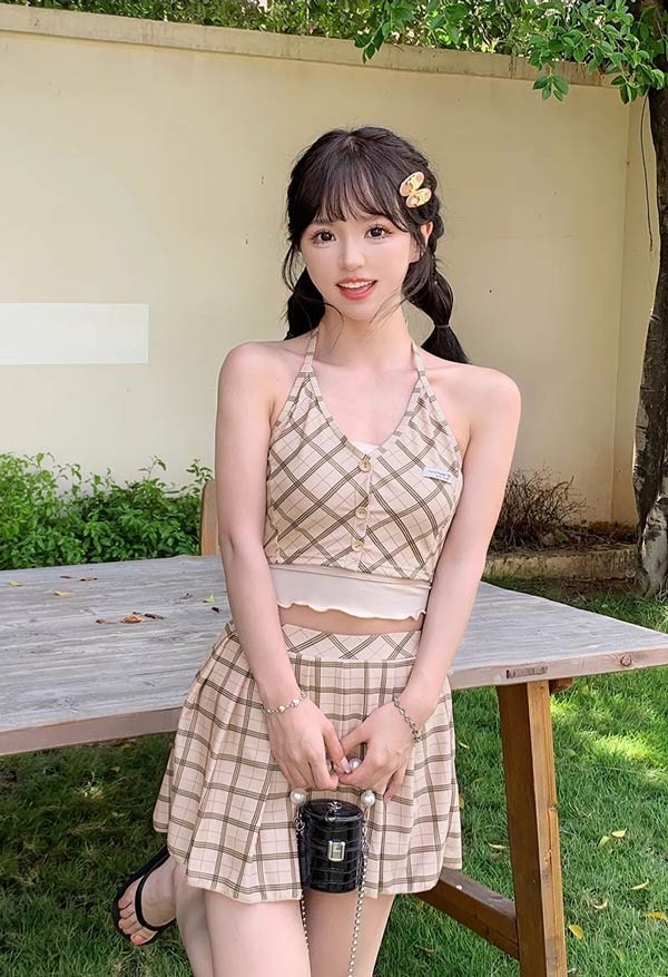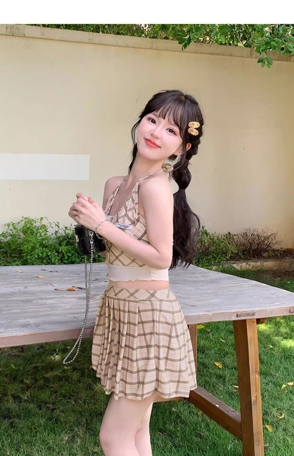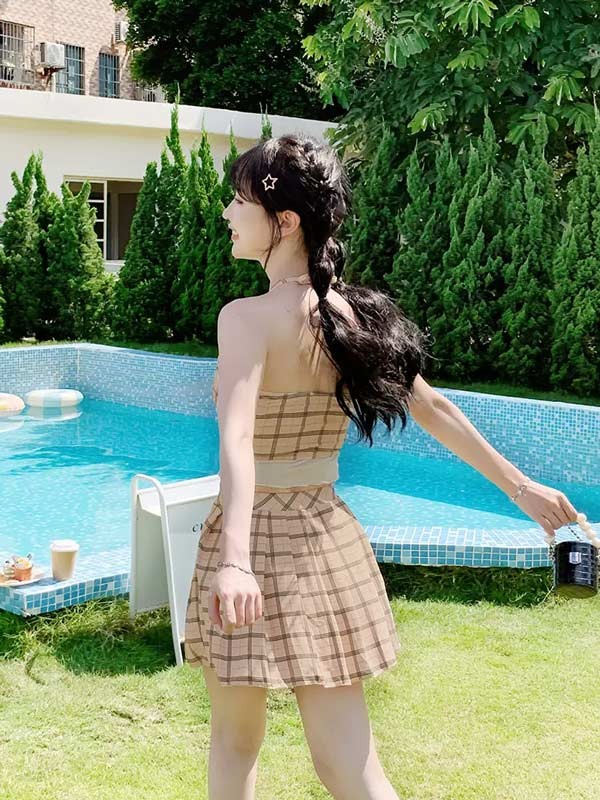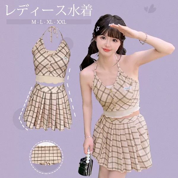 タンキニ レディース 2点セット チェック柄 Vネック 袖なし ワイヤーなし パッド付 着?せ シンプル セクシー 写真映え 撮影用 海 夏 サマー プール リゾート かわいい 旅行 温泉 大人 女性用 ジュニア 学生 女の子 ママ水着 ブラウン