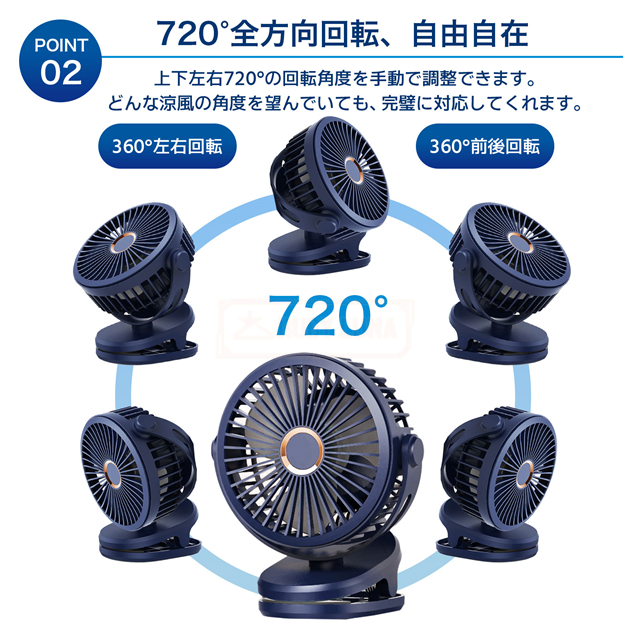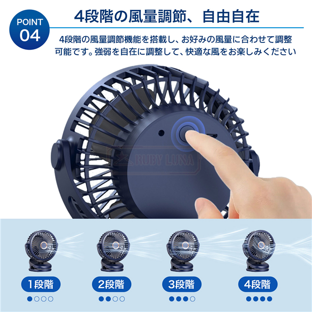 | 【4段階の風速、心のままに】 | ◆このクリップ扇風機は、まるで柔軟多彩なマジシャンのように、4種類の異なる風速モードを備えており、あなたのニーズと気分に合わせて自由に切り替えることができます。 ◆スリープモードは優しい子守歌のように、そよ風を送ります。 ◆ナチュラルモードは穏やかな森の風のように、静かで心地よい風を届けます。 ◆パワフルモードは勇敢な戦士のように、最も強力なパワーをあなたに与えます。 ◆サイクルモードは信頼できる仲間のように、10〜64時間もの間、涼しさを絶え間なく送り続けます。 ◆どんな涼しさを求めていても、思いのままに応えてくれます。 |
