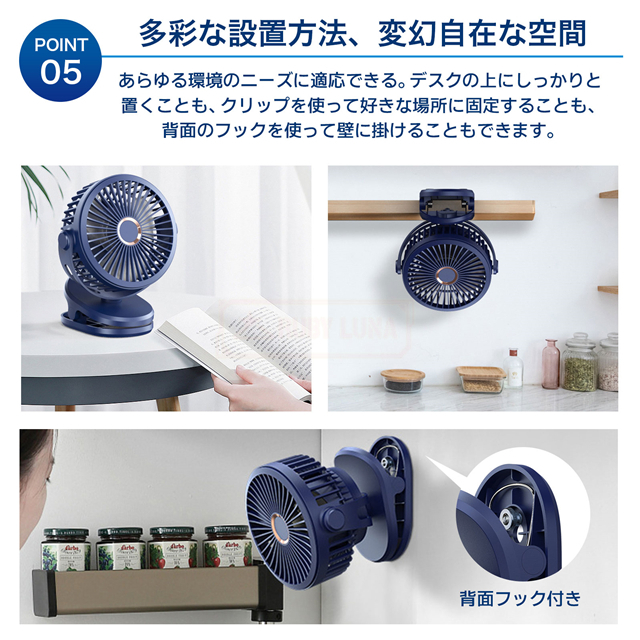 | 【3in1デザイン、多彩な場面で大活躍】 | ◆この扇風機は、まるで多才なアーティストのように、クリップ、スタンド、吊り下げの多機能を備えています。 ◆底部のクリップは器用な手のように、どんな場所にも簡単に取り付けられ、360°の回転自由度であなたが必要とする隅々に涼風を送ります。 ◆家でも、オフィスでも、アウトドアのピクニックでも、影のように付いて行き、夏の頼れる助っ人になります。 |
