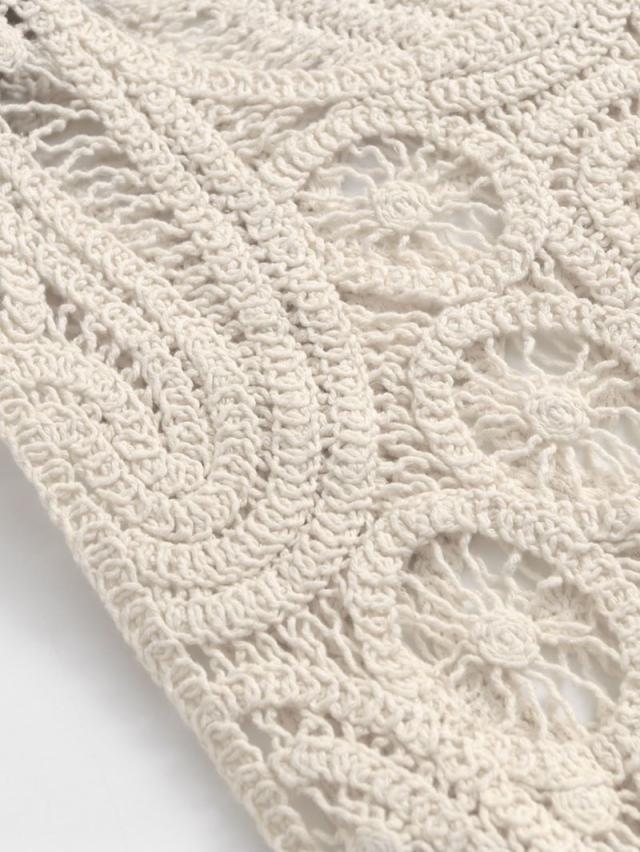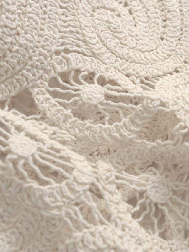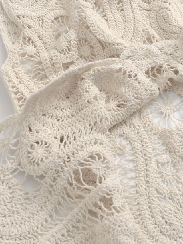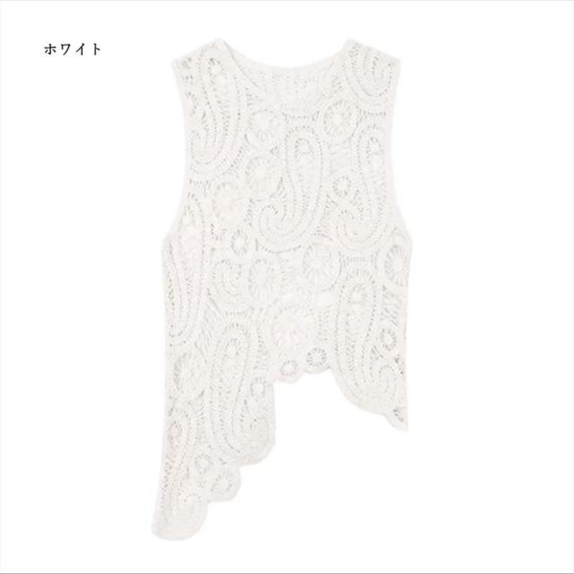 ◎ノースリーブでレイヤードスタイルにもぴったり。透け感のある編み地がおしゃれでかわいい雰囲気を演出します。