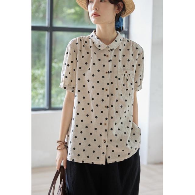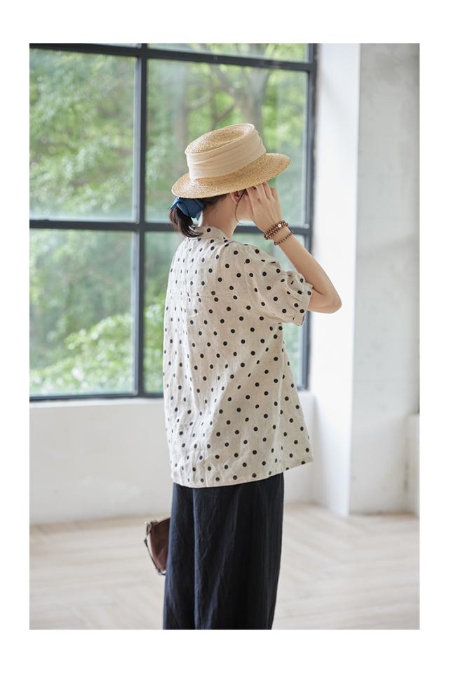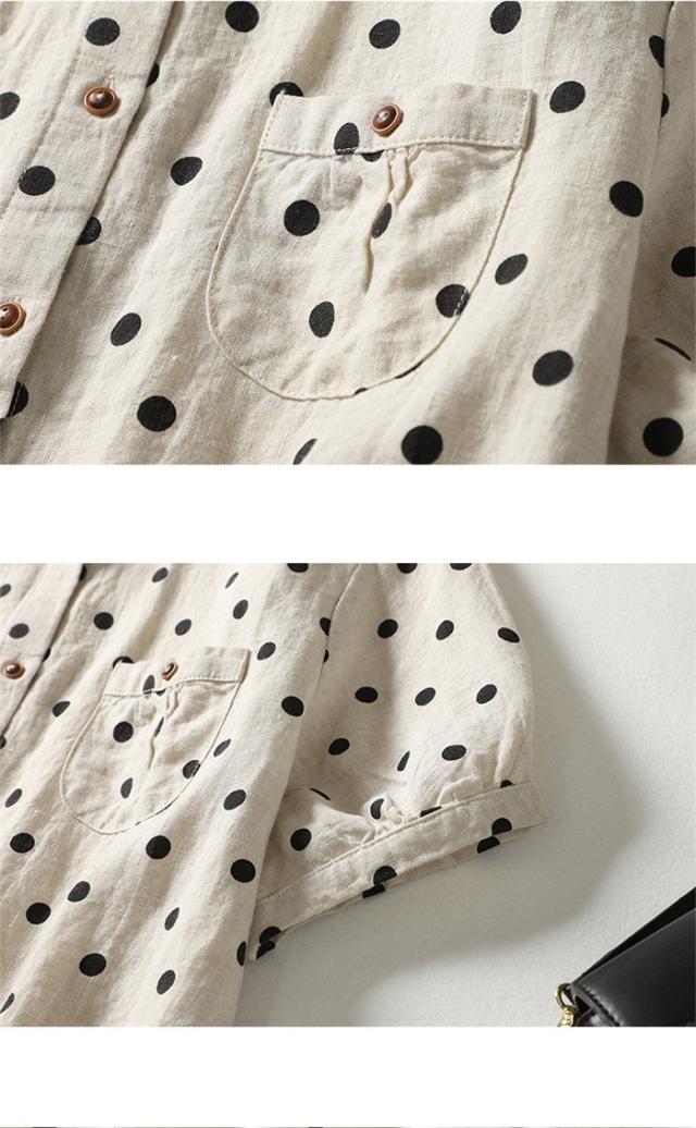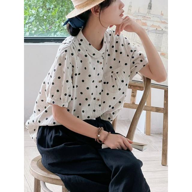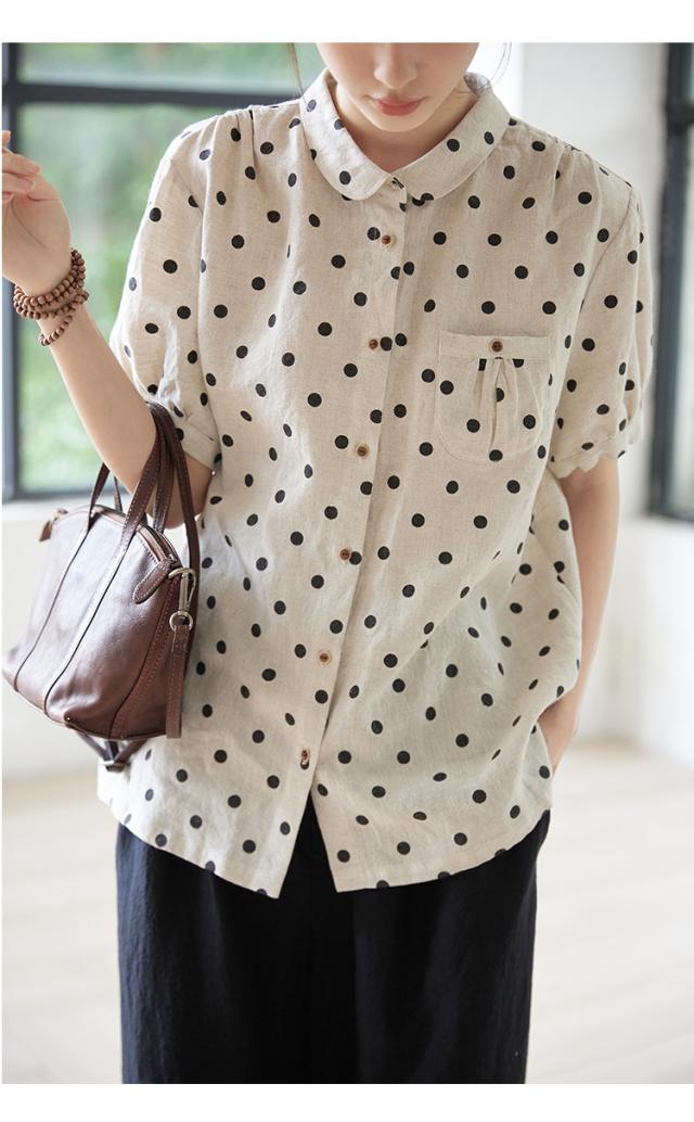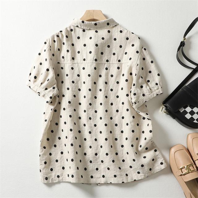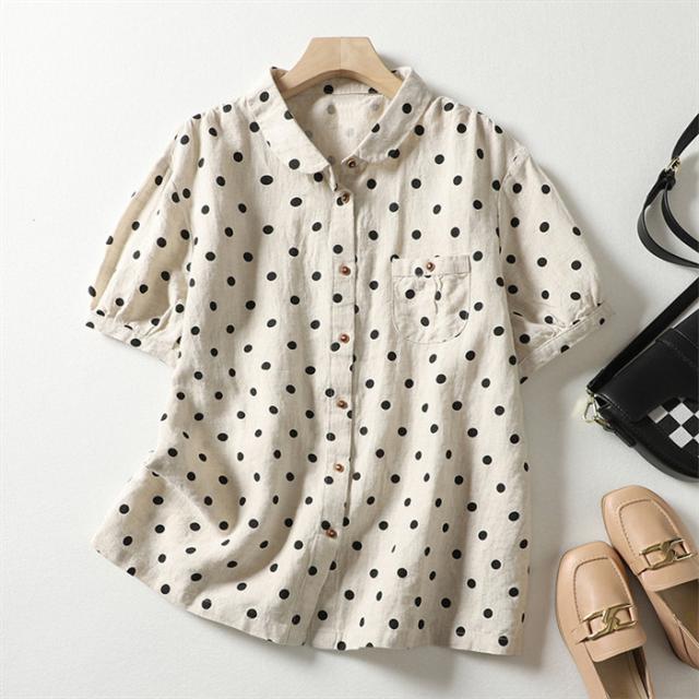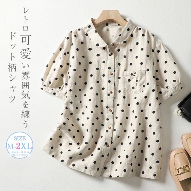 シャツ ブラウス レディース 水玉柄 半袖 ドット シャツ リネン コットン 綿麻風シャツ 大人可愛い ナチュラル 森ガール 夏 トップス パフスリーブ カジュアル 春 夏 秋 大きいサイズ ゆったり