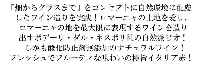 「畑からグラスまで」をコンセプトに自然環境に配慮したワイン造りを実践!ロマーニャの土地を愛し、ロマーニャの地を最大限に表現するワインを造り出すポデーリ・ダル・ネスポリ社の自然派ビオ!しかも酸化防止剤無添加のナチュラルワイン! フレッシュでフルーティな味わいの極旨イタリア赤!