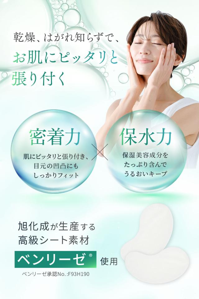 ◆ 旭化成が生産する高級シート素材「ベンリーゼ」を使用。目元口元の凹凸にもピッタリ張り付き、もっちりとした保湿感は一度体感したらやみつきに。