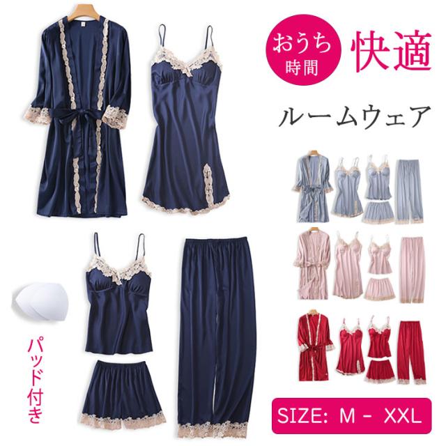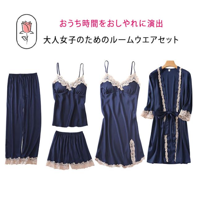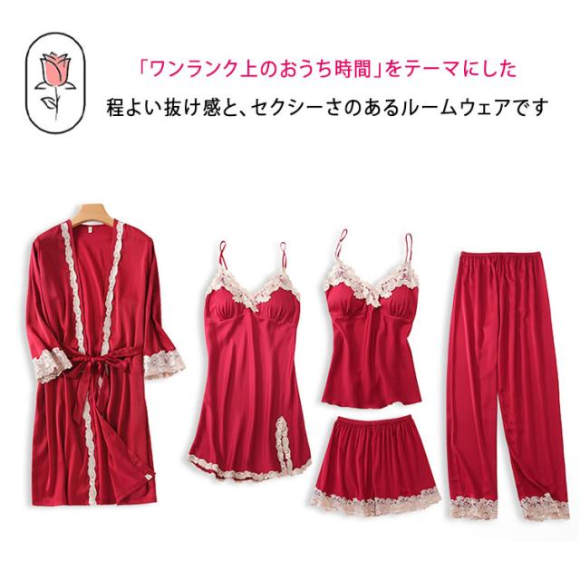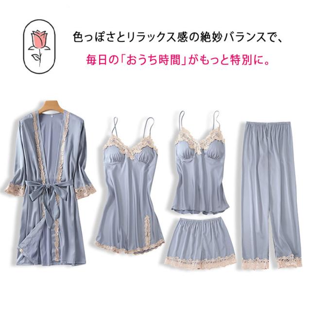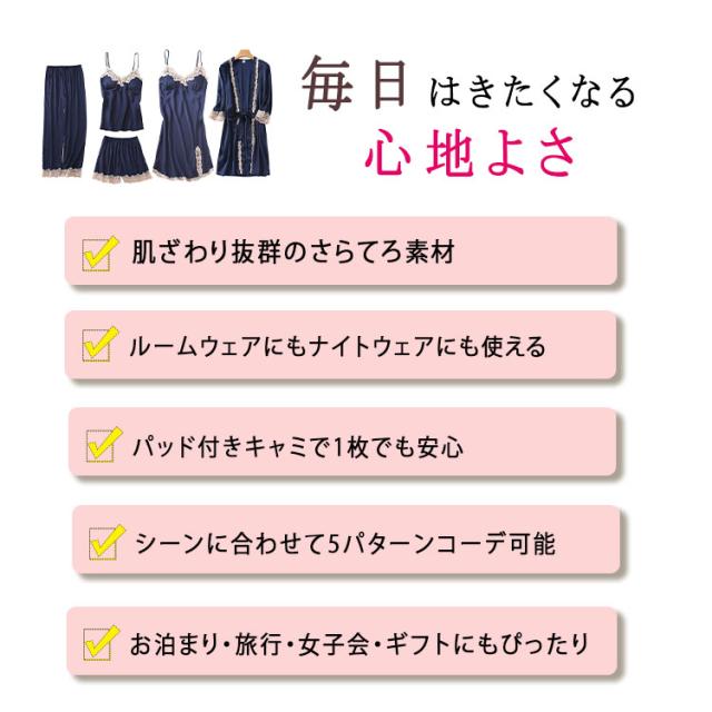 ルームウェア レディース 5点セット パジャマ サテン さらてろ シルクタッチ 接触冷感 ナイトウェア キャミソール ガウン ワンピース パッド付き ショートパンツ ロングパンツ 夏 セクシー 高級感