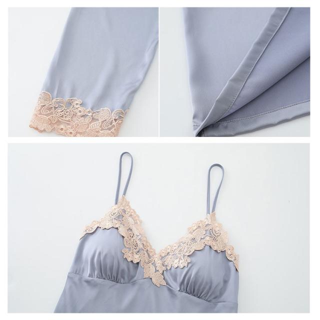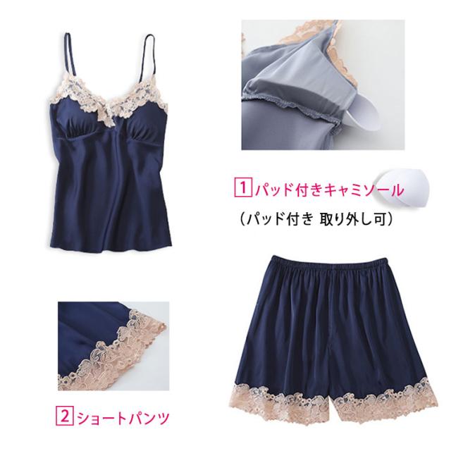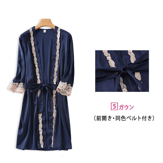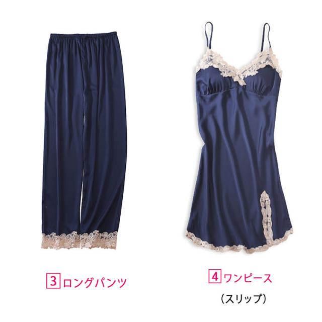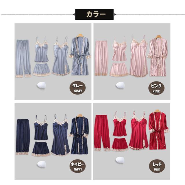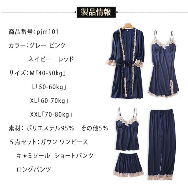 商品名 | ルームウェア レディース 5点セット パジャマ サテン さらてろ シルクタッチ 接触冷感 ナイトウェア キャミソール ガウン ワンピース パッド付き ショートパンツ ロングパンツ 夏 セクシー 高級感 |