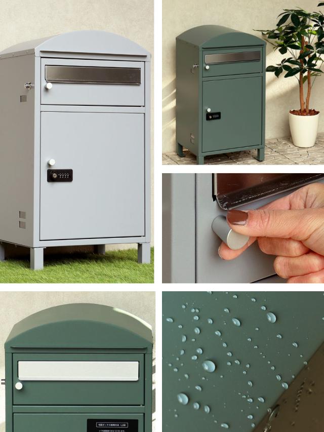 屋根が円形なので、雨水等が流れ落ちやすい形状です。扉の取っ手はシルバーの丸みのあるデザインです。投函口部はステンレス素材です。