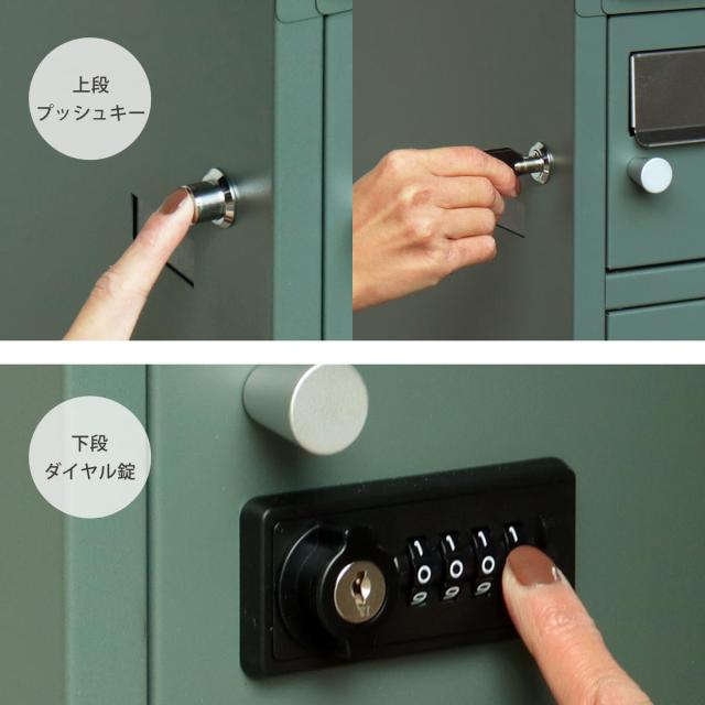 上段は、押すだけで簡単に施錠できます。解錠には鍵を使用してください。