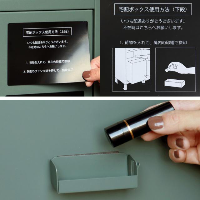 ドライバーの方へのマグネットで取り付け可能なメッセージプレート(上段用と下段用)と印鑑ケースが各段に付属しています。ポスト部分を宅配ボックスとして荷物の受け取りに使えます。