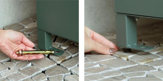 | アンカー固定用穴 地面に固定するためのアンカー用の穴があります。 | ガタ付きを防止するアジャスター アジャスターがあるので、安定して設置できます。 |