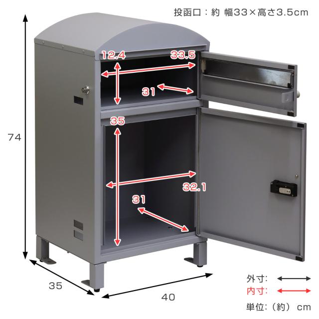 | サイズ | 約 幅40×奥行35×高さ74(cm) (取っ手、アジャスター含む) 上段 投函口:約幅33×高さ3.5cm 取出口:約幅33.5×奥行31×高さ12.4cm 下段 取出口:約幅32.1×奥行31×高さ35cm |