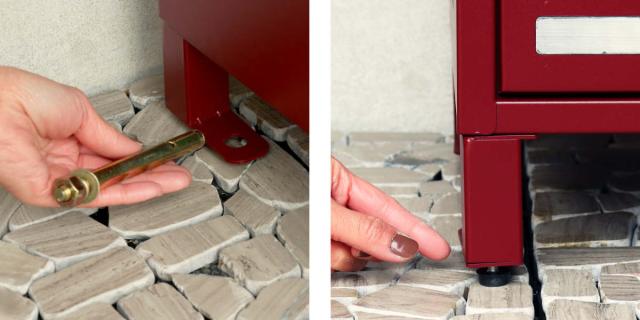 | アンカー固定用穴 地面に固定するためのアンカー用の穴があります。 | ガタ付きを防止するアジャスター アジャスターがあるので、安定して設置できます。 |