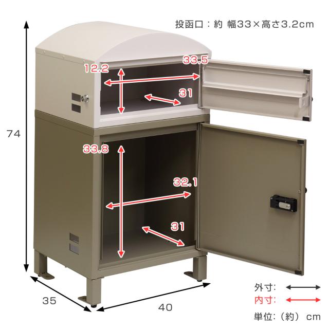 | サイズ | 約 幅40×奥行35×高さ74(cm) (取っ手、アジャスター含む) 上段 投函口:約幅33×高さ3.2cm 取出口:約幅33.5×奥行31×高さ12.2cm 下段 取出口:約幅32.1×奥行31×高さ33.8cm |