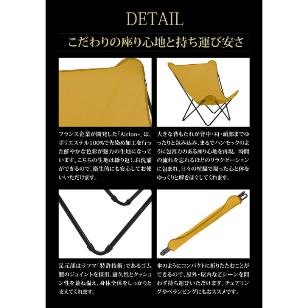 (3) Lafumaこだわりの金属フレームは「スチール素材」を採用。適度に反発性のあるフレームなので体重の圧力を分散させ、チェア全体で身体を包み込む構造になっています。また、こちらのフレームは屋外の過酷な環境にも耐えられる様に、車の塗装にも使われる「板金塗装」を採用。高い耐UV性のポリエステル塗装で、屋外でも錆びにくく、機能性の高い作りになっています。