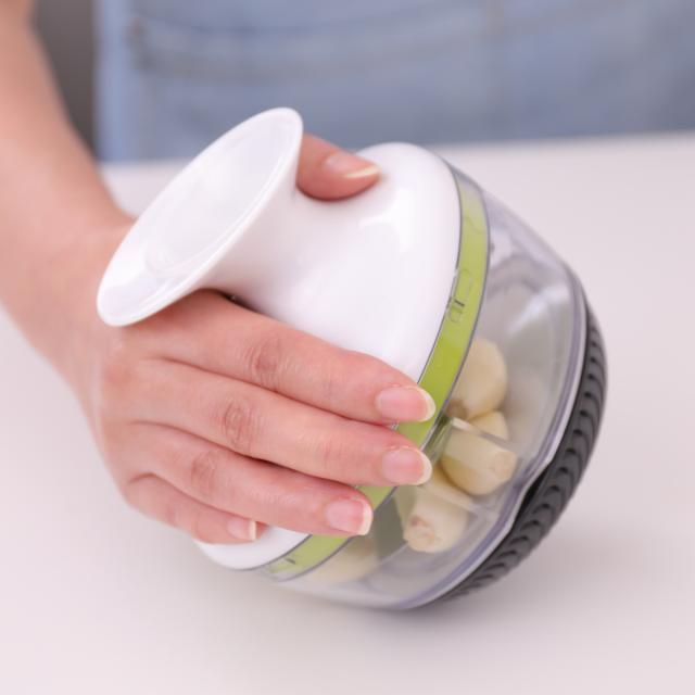 人間工学に基づいたデザインで、片手で楽しく調理ができるチョッパーです。クルクルひねったり、コロコロ転がすだけで、みじん切りができます。電源不要で、自分で刃を回転させるので、みじん切りをお好みのサイズに調整しやすいです。