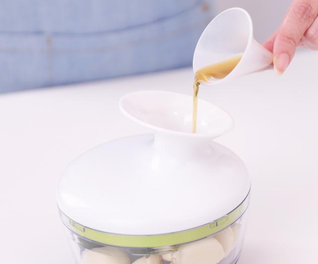 フタをしたまま、調味料の追加ができるじょうごが付いています。ソースやドレッシング作りの際に便利です。